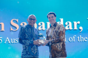 Utusan Khusus Urusan Samudera Hindia, Anggota Parlemen Hon Tim Watts, menyerahkan Penghargaan Alumni Australia Tahun Ini kepada William Sabandar, PhD, pada Makan Malam Gala Alumni Australia 2025 di Jakarta. Foto: Istimewa/Australia Awards in Indonesia.