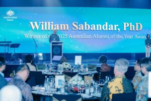 William menyampaikan sambutannya usai menerima Australian Alumni of the Year Award 2025. Foto; Istimewa/Australia Awards in Indonesia.
