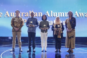 William bergabung dalam foto bersama dengan sesama pemenang, Utusan Khusus untuk Urusan Samudera Hindia, Anggota Parlemen Yang Terhormat Tim Watts, dan Kuasa Usaha Australia, Ibu Gita Kamath. Foto: Istimewa/Australia Awards in Indonesia.