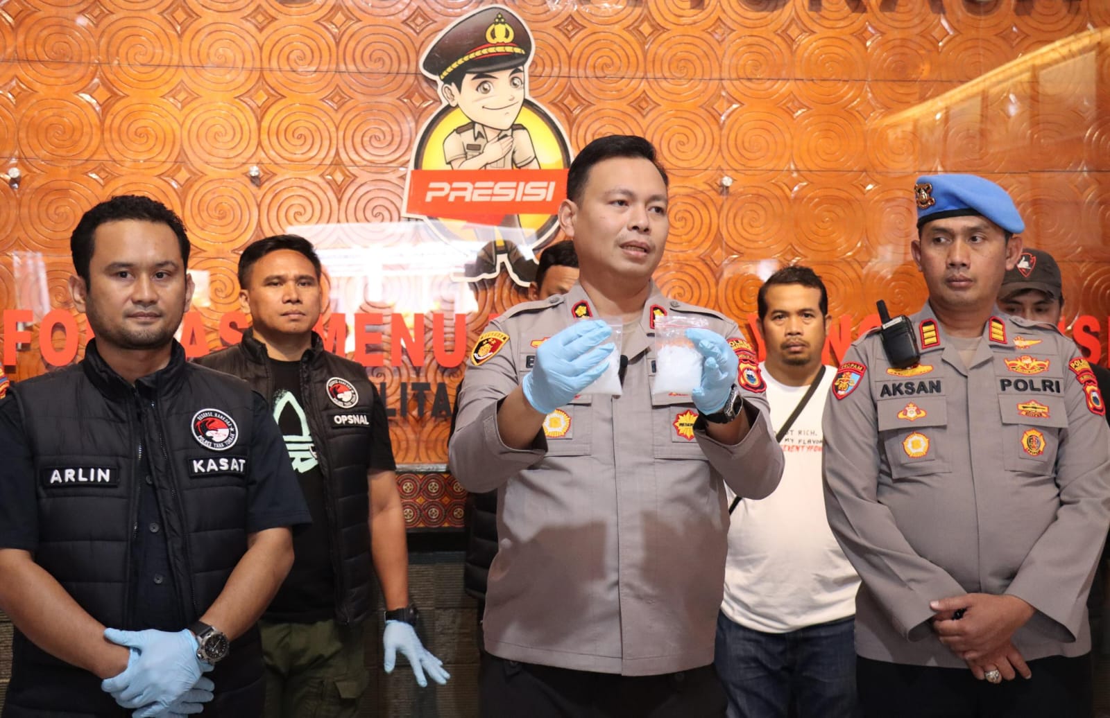 “Kini ke 4 (empat) terduga pelaku beserta barang bukti berupa 2 (dua) sachet di duga berisi narkotika jenis, 6 (enam) buah timbangan elektronik, 1 (satu) set alat isap (bong), 3 (tiga) buah handphone, 5 (lima) ball sachet plastic klip bening, 4 (empat) potongan pipet, 1 (satu) buah korek dan uang tunai Rp. 400.000 telah diamankan di Polres Tana Toraja guna proses penyidikan,” terang Kapolres.